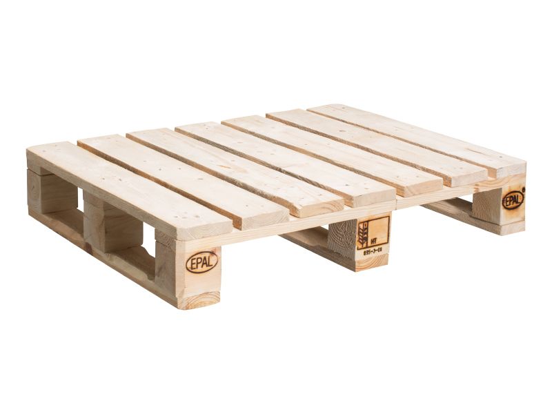 Compact wooden pallet with a length of 800 mm, a width of 600 mm and a height of 144 mm. Load capacity up to 500 kg. The EPAL 6 half pallet is used as a display pallet and can be placed directly in the sales room thanks to its compact dimensions. The EPAL 6 half-pallet is ideal for transporting and storing goods in national and international goods transport. The basic structure of the EPAL 6 half pallet allows for easy transport and stable storage of the goods. Accessibility from 4 sides enables efficient handling of the EPAL 6 half-pallet during the production, storage and transport of workpieces, goods or goods. The EPAL 6 half pallets are compatible with all common industrial trucks, storage systems and standard load carriers.