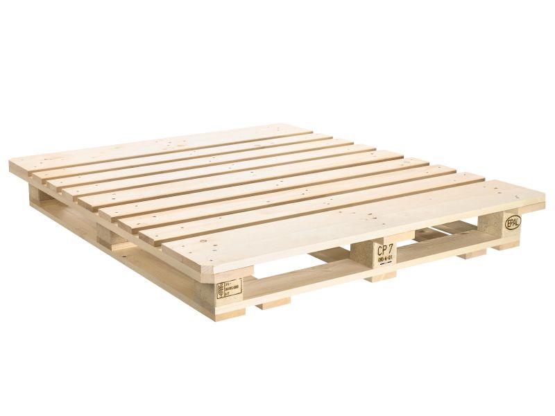 Chemical pallet according to IPPC/ISPM 15 standard. Length 1,300 mm, width 1,100 mm and height 156 mm. The EPAL CP 7 range has been specially developed for use in the European chemical industry. The EPAL CP 7 pallet is ideal for the transport and storage of all types of chemical goods. The basic structure of the EPAL CP 7 pallet allows for easy transport and stable storage of the goods. Accessibility from 4 sides enables efficient handling of the EPAL CP 7 pallet during the production, storage and transport of goods or merchandise. The EPAL CP 7 pallets are compatible with all common industrial trucks, storage systems and standard load carriers.